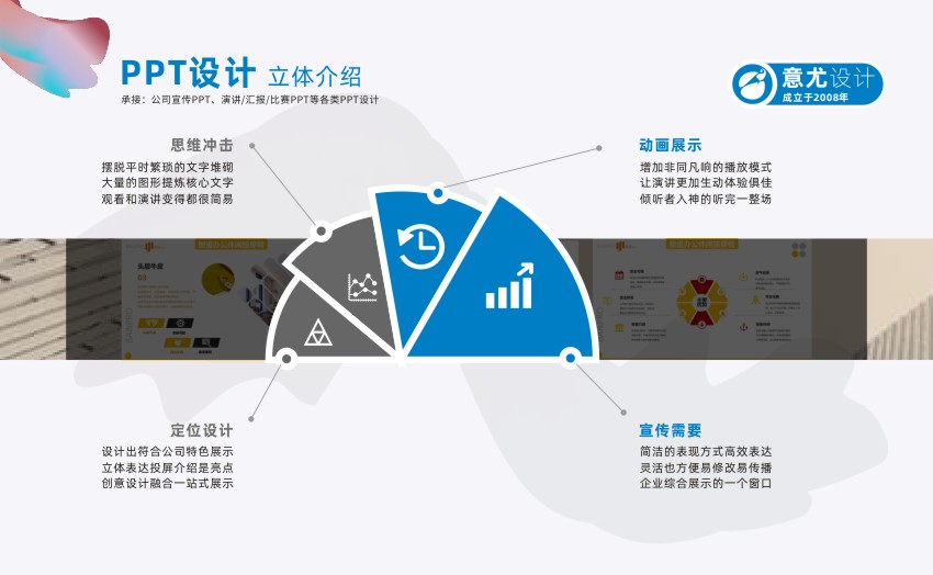 蘇州意尤文化傳播有限公司是一家有著多年廣告設計經驗的蘇州知名廣告企業 主要業務有蘇州PPT設計、蘇州產品PPT設計、蘇州企業PPT設計、蘇州會議PPT設計、蘇州項目PPT設計、企業VI設計、設計印刷宣傳冊/樣本/單頁/名片等 自2007年成立以來,蘇州意尤廣告公司與蘇州及蘇州各市的幾百家中外企業進行了廣告設計合作,經過多年發展公司已形成了以企業PPT設計、企業VI設計,廣告設計,廣告印刷,樣本設計,宣傳冊設計,名片印刷,菜譜制作,單頁,宣傳單等一批特長業務,相信在各位新老客戶的關心下,本公司會得到更大的發展,同時為客戶的發展宣傳保駕護航。